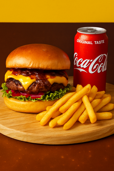 Pão brioche com maionese especial, hamburguer 180g e mussarela, rúcula, cebola roxa e bacon.1 coca lata + 1 batata 120 gramas.