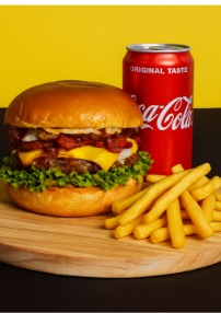 Pão brioche com maionese especial, hamburguer 180g e mussarela, cheddar, alface, rúcula, tomate, cebola roxa, cebola caramelizada, ovo e bacon.1 coca lata + 1 batata 120 gramas.